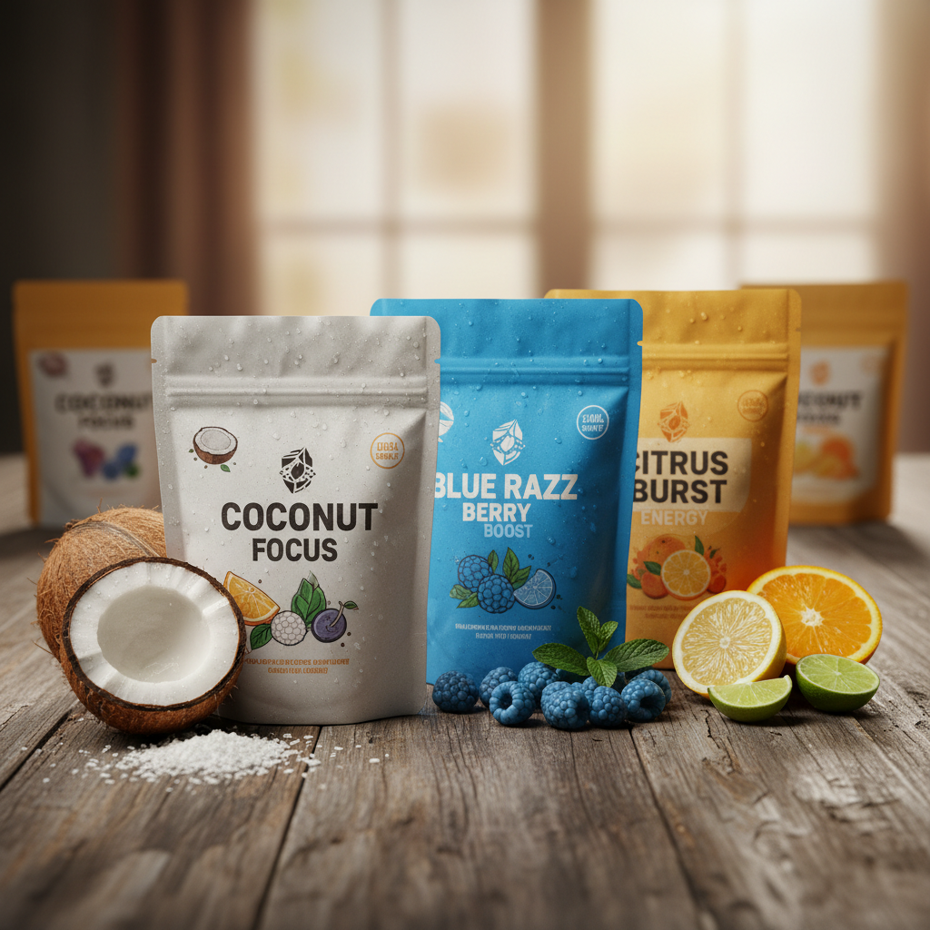 Flat-Lay Nootropic Pouches: A clean, modern flat-lay of pouches and fresh ingredients.
