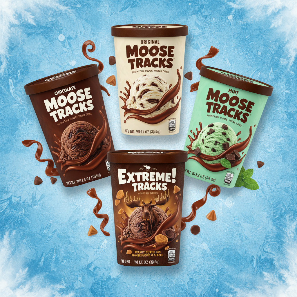 Popular variations include Chocolate Moose Tracks, Mint Moose Tracks, Extreme! Moose Tracks, and Coffee Moose Tracks, among others.